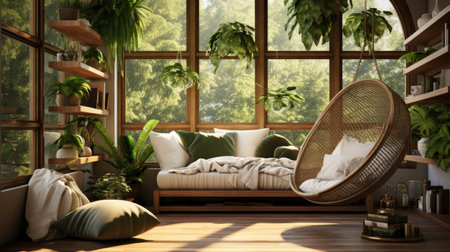 Cozy summer retreat with natural light and vibrant greenery in a serene space.