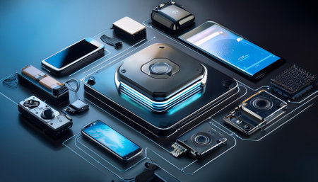 modern tech devices featuring a central gadget and various accessories