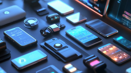 A collection of modern electronic devices is laid out on a dark surface. Various smartphones, smartwatches, and accessories display vibrant screens, showing different interfaces and designs.