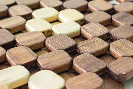 Old used kitchen stand under the hot, made of small flat wood pieces of rhombic shape and then decorative processed in the form of burning, front view on a gray background