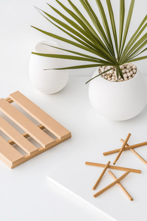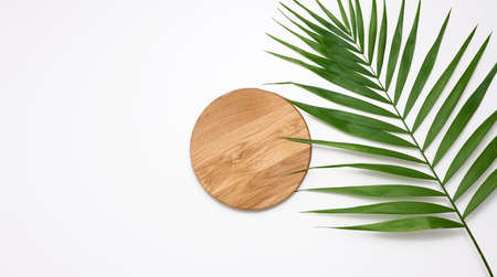 a brown wooden platform for displaying cosmetic products, goods and a green leaf of a palm tree. white background, top view