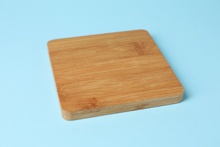 Stylish wooden cup coasters on light gray table, flat lay. Space for text