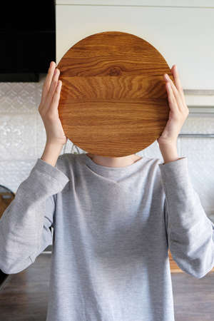 Empty round cutting board on a wooden table. Space for text. Top view.