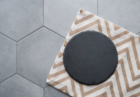 Empty black slate board with napkin on gray ceramic tile in hexagon shape. Board for demonstration and advertising of food or products on a trendy background. Top view and copy space.