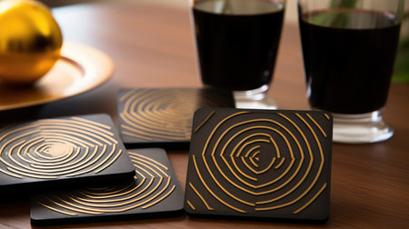 A collection of intricately designed blue and white coasters with gold accents on a matching blue surface