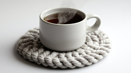 a white cup of green tea on a silicone stand for hot. Nearby are silicone coasters for hot. Nearby there are silicone coasters for hot in different colors. Banner with space for text