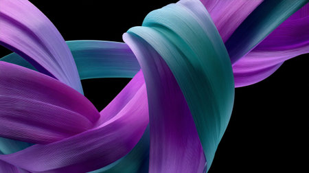 A swirling luminous ribbons glowing in purple and cyan tones create mesmerizing visual effect, intertwining gracefully against black background, evoking sense of fluidity and elegance