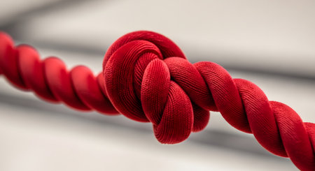 A macro, close-up shot of a thick, luxurious red rope with a complex, tight knot in the center. The detailed texture of the corduroy or velvet material is visible under soft lighting. This image can symbolize connection, strength, a problem, or an unbreakable bond.
