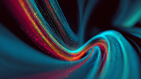 An abstract artwork showcases a swirling vortex of bright colors against a dark backdrop. The composition features smooth gradients of red, orange, yellow, and blue hues. The image's dynamic lines and lighting suggest movement, making it appropriate for various design applications. It offers possibilities for digital art projects and commercial designs.