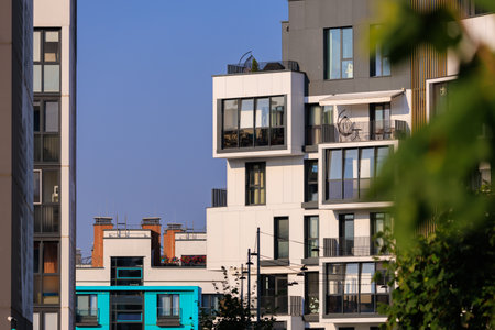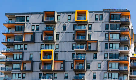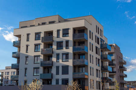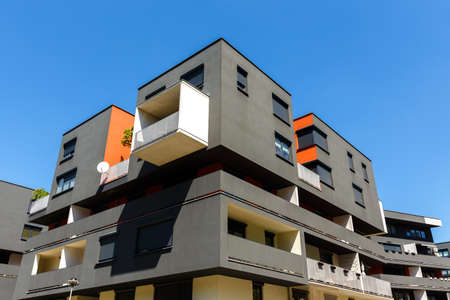 Contemporary residential building exterior in the daylight. Modern apartment buildings on a sunny day with a blue sky. Facade of a modern apartment building