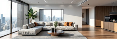 An interior shot showcases a contemporary living room with neutral tones, large windows, and a city view. Soft textures are evident on a sectional sofa and chairs. Daylight fills the space, suggesting a bright and airy atmosphere. The image could be used for lifestyle, interior design, or real estate marketing.
