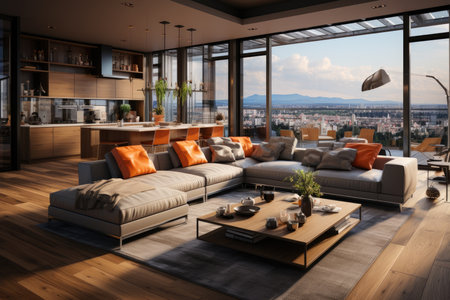 Modern luxury apartment living room with city view and contemporary design. That the image is generated using AI.