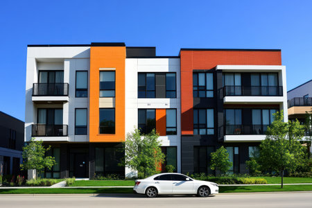 A vibrant apartment building showcases a mix of orange and red brick. Multiple balconies and large windows are visible, reflecting the bright daytime atmosphere. Generative AI