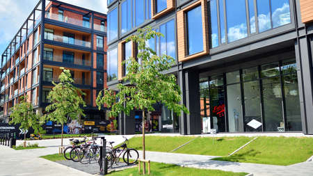 Gdansk, Poland - August 26, 2021: Modern style expensive apartment building near to the Gdansk city center with huge built-in balcony.