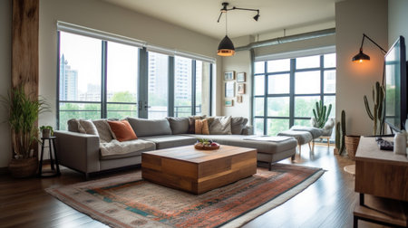 Modern living space with large windows and stylish furniture in a cozy urban loft setting
