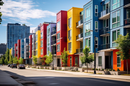 Colorful apartment buildings in vibrant hues flank a green pathway. The sunlight illuminates their facades, showcasing the contemporary design amidst landscaped surroundings on a clear day.