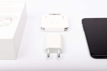 Paris, France - May 14, 2020: packaging of the new black iPhone SE 2020 from the multinational company Apple during the days of its studio release on a white background
