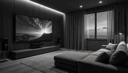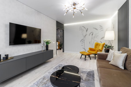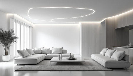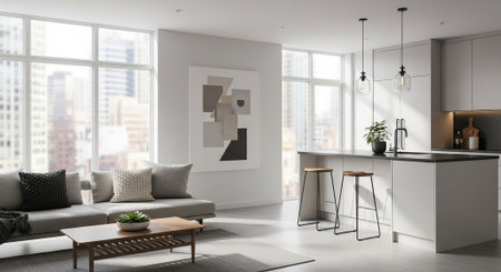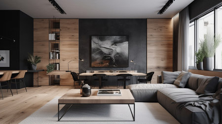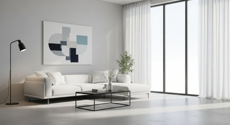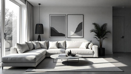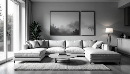 Modern monochrome living room interior with minimalist design elements
