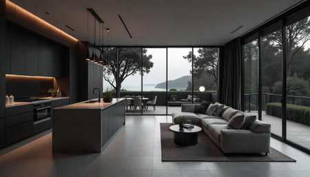 Modern open plan living area with stunning coastal view