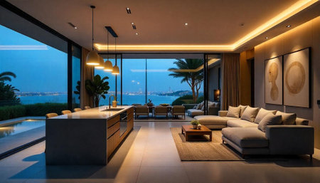 Luxurious open-plan living space with an ocean view at dusk