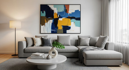 Contemporary stylish room with gray couch, blue abstract artwork, coffee table, square molding and decorative pillows