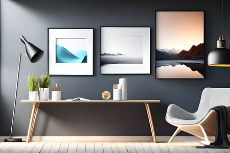 Living room interior with sofa, coffee table and picture frames on wall