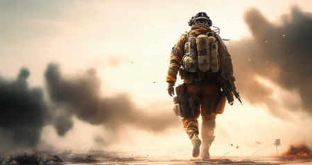 Soldier in uniform walking on battlefield. Generative AI illustration