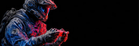 Futuristic soldier in tactical gear plays a video game, illuminated by colorful lights on a black backdrop.
