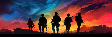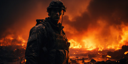 In the fading light of a fiery sunset, a soldier's silhouette emerges, a symbol of honor and sacrifice as day gives way to night. Generative AI