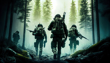 A group of army soldiers fighting with guns and defending their country in forest Memorial Day, remembering the fallen soldiers around the world