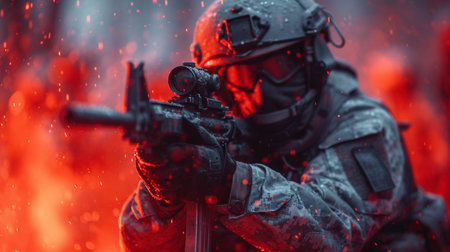 Infantry soldier shooting during military combat training.. Army elite troops marksman, special operations forces sniper wearing mask and glasses, night-vision or infrared thermal imaging device on helmet, holding service rifle with optical sight and silencer