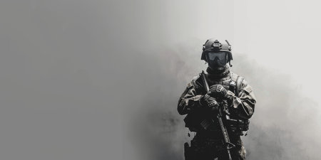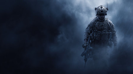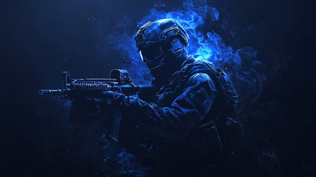 A soldier in full combat attire is featured amidst a background of swirling atmospheric smoke and a dominant dark blue color. The composition highlights the silhouette of the individual and equipment. This image could be suitable for editorial content, websites, and various commercial applications that require imagery with a sense of action and tension.