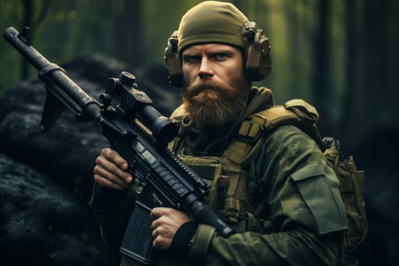 War concept. A bearded soldier in a special forces uniform fighting an enemy in a forest area. Selective focus