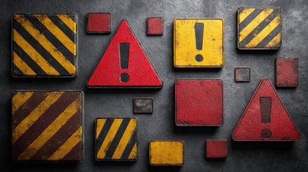 Collection of warning signs featuring bold colors and patterns arranged on a dark surface, highlighting the importance of safety and alertness.
