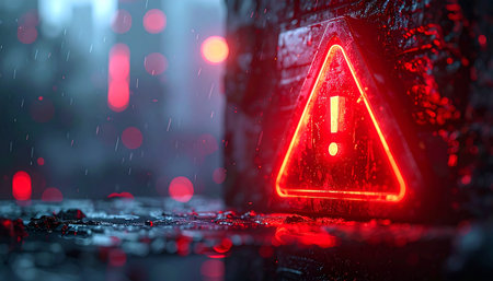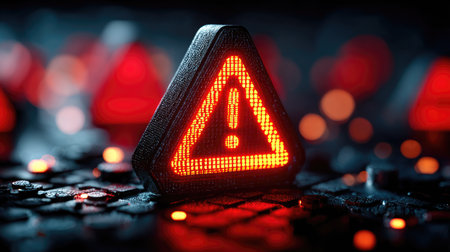 A striking visual of a warning sign illuminated in red, set against a dark background filled with hexagonal shapes, evoking a sense of urgency and caution.