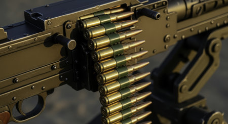 Heavy machine gun with a visible belt of .50 caliber ammunition. polished brass casings and green tipped bullets are loaded into the weapon, ready for action.