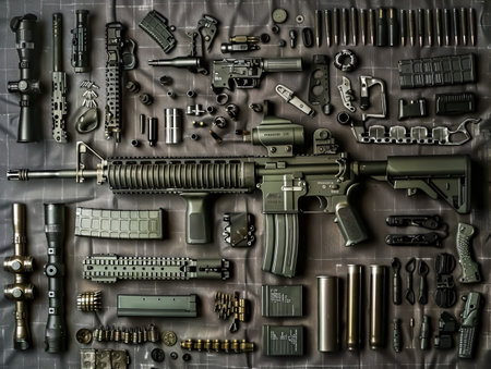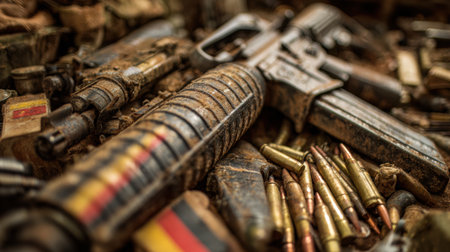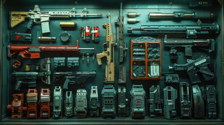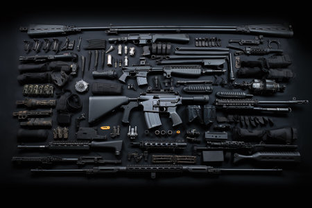 Detailed illustration of military weapons and equipment arranged on a dark background, ideal for tactical and defense themes. Explore the elements of military strategy.