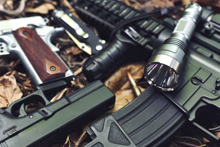 War guns arsenal modern military assault rifles shotgun weapon arms outdoors on natural background