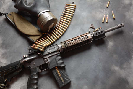 Assault rifle with ammunition on camouflage uniform, and military equipment for army, bullets and a magazine