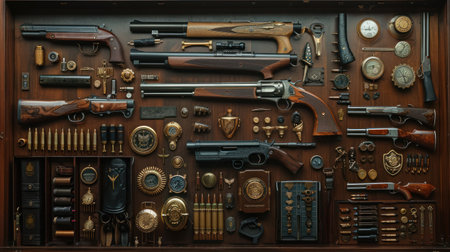 A hitmans arsenal laid out with precision each weapon telling a story of missions past under the cold light of a hidden armory
