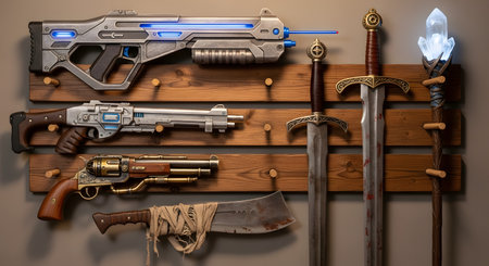A collection of fantasy and science fiction prop weapons is displayed on a wooden wall rack. The arsenal includes a futuristic laser rifle, a shotgun, a steampunk pistol, medieval swords, a rustic cleaver, and a glowing magic staff, representing different genres of fiction, gaming, and cosplay.