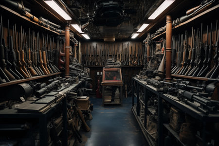 Army weapon assortment on rack at store warehouse. Inside storage room with military equipment, arsenal of firearm. Generative AI