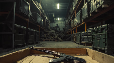 Warehouse with weapon and army equipment, assault rifle is in wooden box in dark storage. Illegal smuggle arsenal of guns. Concept of war, military industry, background, violence, package. Generative AI.
