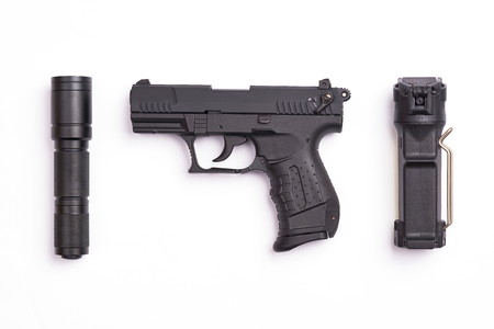 self defense gear - pistol, pepper and tactical flashlight on white background