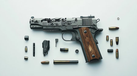 A detailed view of a disassembled handgun with its components, showcasing precision engineering and craftsmanship. Perfect for safety and maintenance themes.