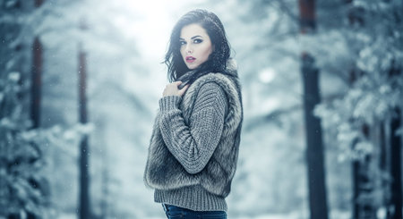 A woman in a snowy forest wearing a fur vest and sweater, with a soft focus background of trees and snowflakes
