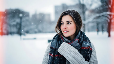 A woman in a warm coat and oversized scarf standing in a snowy park, with snowflakes falling around her