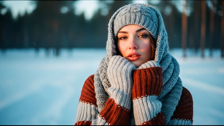 Winter portrait of young beautiful woman in a knitted hat and scarf