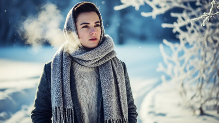 A woman standing in a snowy forest, wearing a warm sweater, scarf, and hat, with steam visible from her breath, surrounded by snow-covered trees