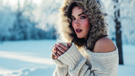 A woman standing in a snowy landscape, holding a warm drink, dressed in a cozy sweater and coat, with trees in the background